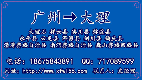 廣州到云南大理市物流廣州鑫富物流有限公司,電話:020-87461290 ,手機:18675843891 ,QQ:717089599 聯系人:袁經理,為廣大新老客戶提供優(yōu)質廣州到云南大理市物流專線及配送服務,歡迎來電咨詢,鑫富物流公司在珠三角的深圳、佛山、珠海、東莞、中山、惠州、江門、肇慶都可以上門提貨,貨到云南大理市可以送貨到各鄉(xiāng)鎮(zhèn)及偏遠地區(qū),讓客戶方便收貨,鑫富國家AAA物流企業(yè)–貨運一站式解決方案。